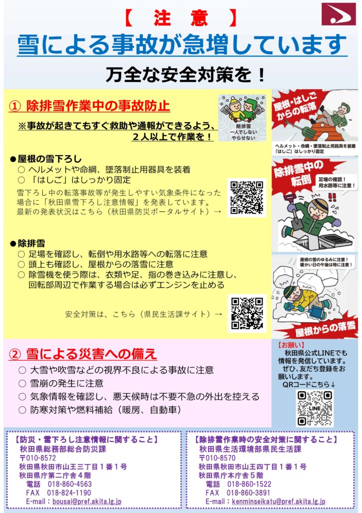 ホーム 秋田市からのお知らせ 除排雪作業中の事故に注意しましょう 2026年02月24日ゆき関連 除排雪作業中の事故に注意しましょう 県内では、記録的な大雪の影響による除排雪中の事故が増加しており、過去10年間で2番目に多い死者数となっています。 2月に入ってからは、各地で屋根からの落雪や転落による死傷者が相次いでいます。 秋田市では、気温の上昇や降雨により雪解けが進んでいることから、寒暖差による雪害事故に引き続き注意しましょう。 お知らせ一覧へ戻る 次の記事へ